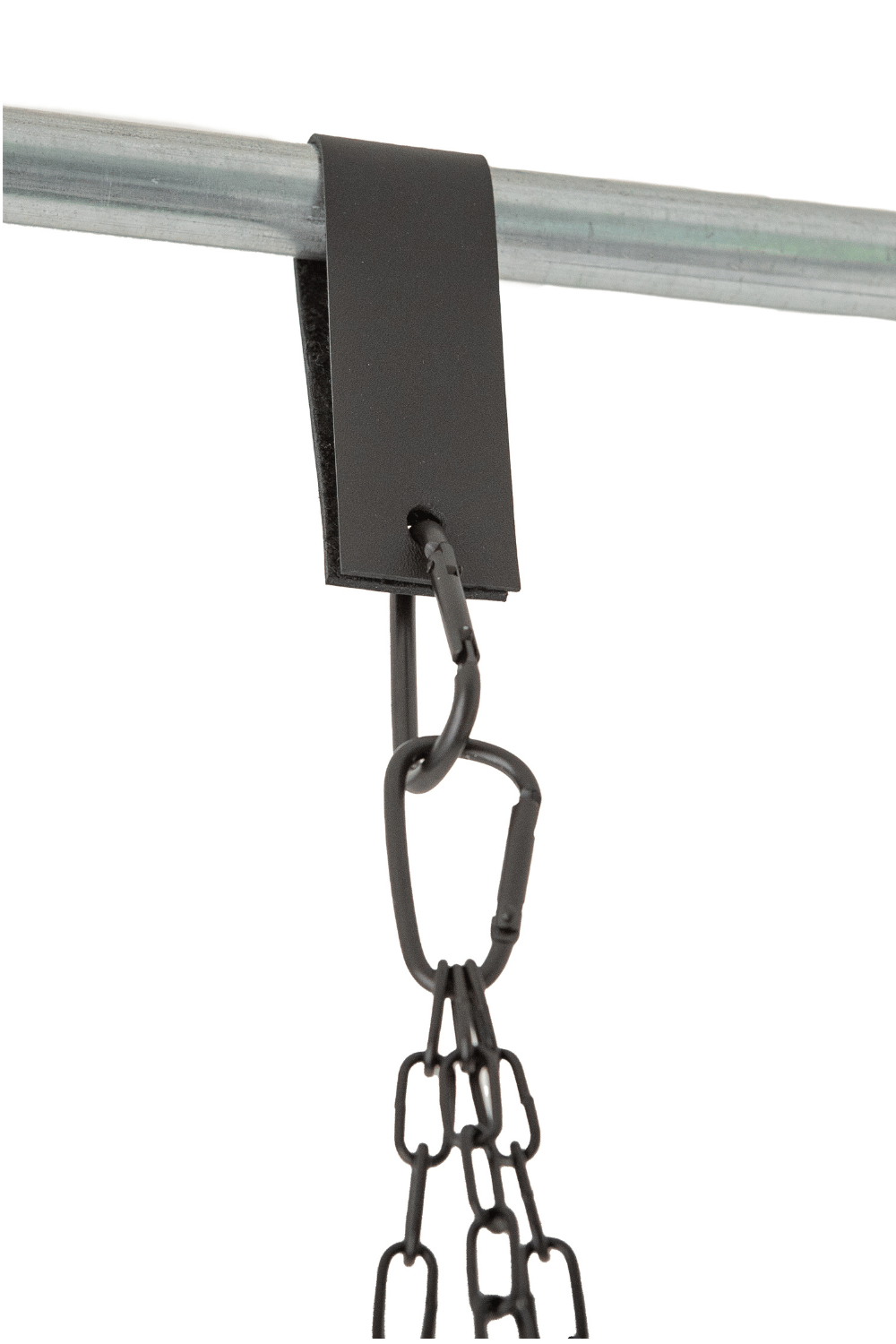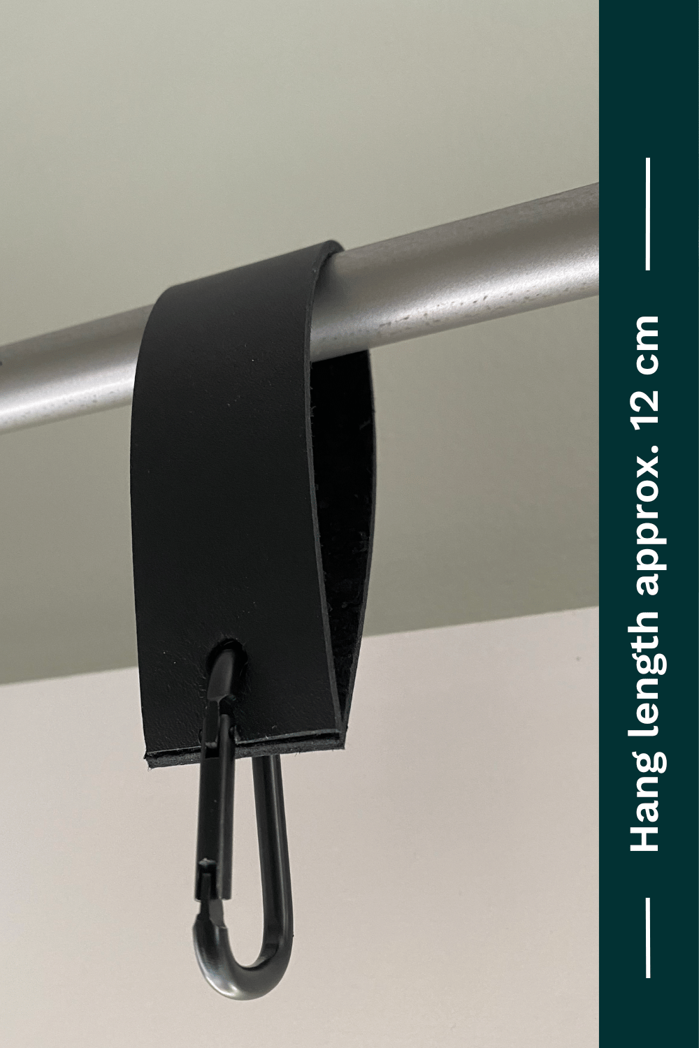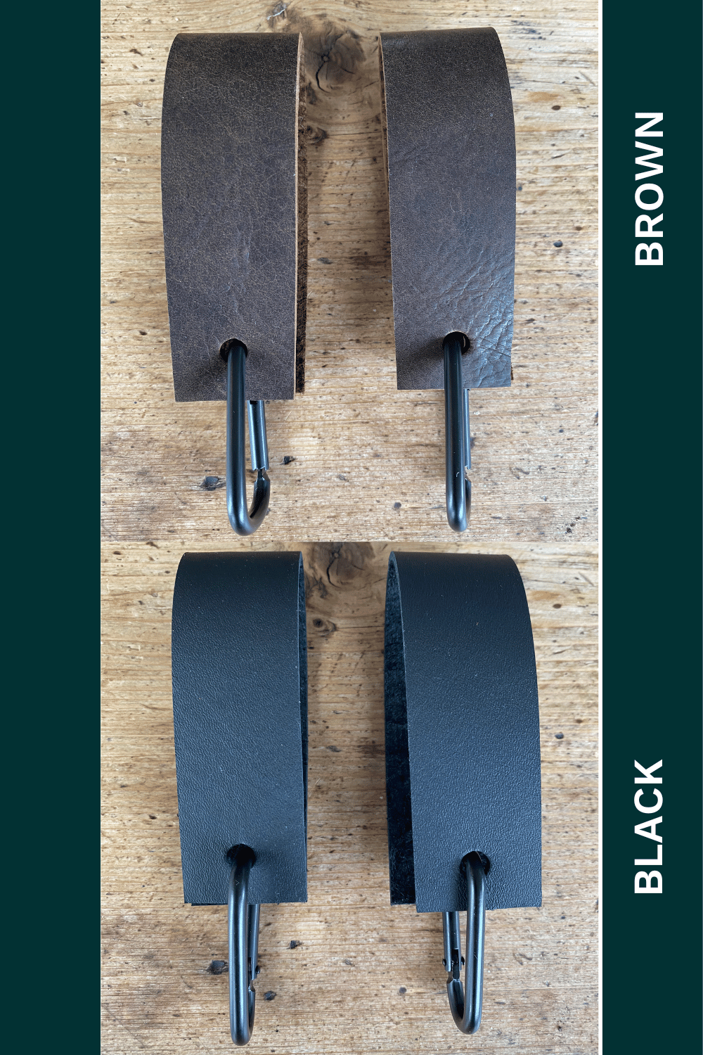 Sold as a set of two (2 leather tabs with one matt black aluminium carabiner each).